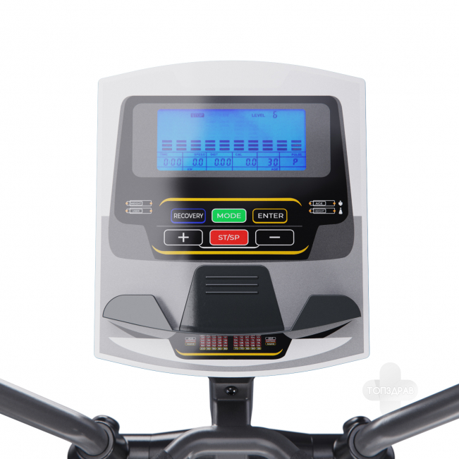 Эллиптический тренажер с задним расположением маховика для домашнего использования. Тренировка на эллиптическом тренажере - это прекрасная альтернатива бегу трусцой или ходьбе, с разницей в высоком сжигании калорий. Благодаря интенсивному движению рук верхние участки тела напрягаются, все тело укрепляется, повышается эффективность тренировки. Модель с удлиненной базой и бесшумной магнитной нагрузкой - система сопротивления с постоянным магнитом и тончайшей настройкой интенсивности. Электронная регулировка сопротивления с помощью компьютера. На тренажере установлен простой и современный компьютер с ЖК-дисплеем. Управление с помощью кнопок. На дислее отображается весь необходимый список параметров тренировки. Измерение пульса осуществляется с помощью встроенных датчиков на дополнительных поручнях. Мощная рама тренажера, усиленная конструкция из стального профиля, позволит заниматься пользователю весом до 120 кг. Широкие педали с нескользящей вставкой. Транспортировочные колеса в передней части обеспечивают свободное перемещение тренажера по комнате. Задний стабилизатор с регулировкой положения на неровной поверхности. Показания консоли : время, расстояние, количество сожженных калорий, скорость, пульс, жироанализатор BodyFat, фитнес-тест Recovery